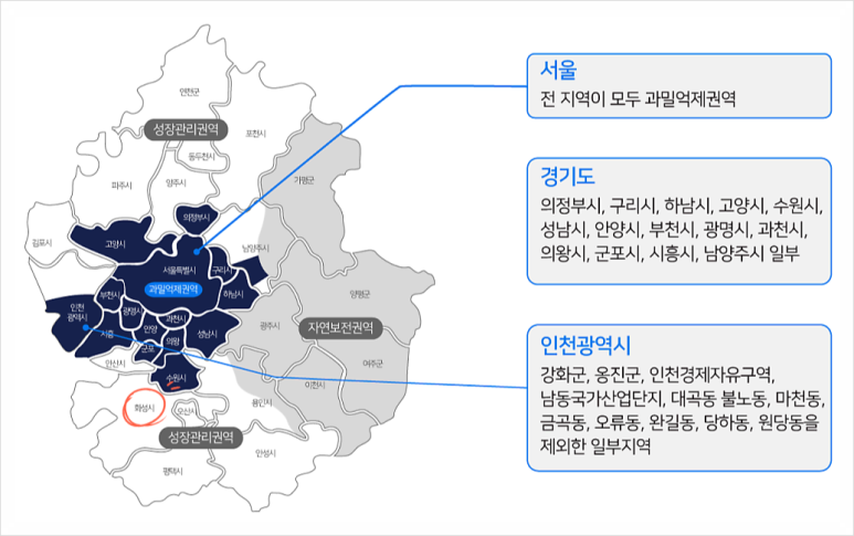 수도권 과밀억제권역이란 수도권정비계획법에 따라 인구와 산업이 지나치게 집중되었거나 집중될 우려가 있어 인구와 산업을 이전하거나 정비할 필요가 있는 지역인데요.
