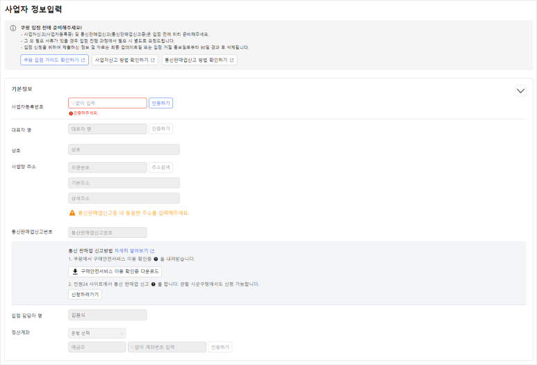 상품 등록 전에 사업자 인증을 먼저 시작합니다.