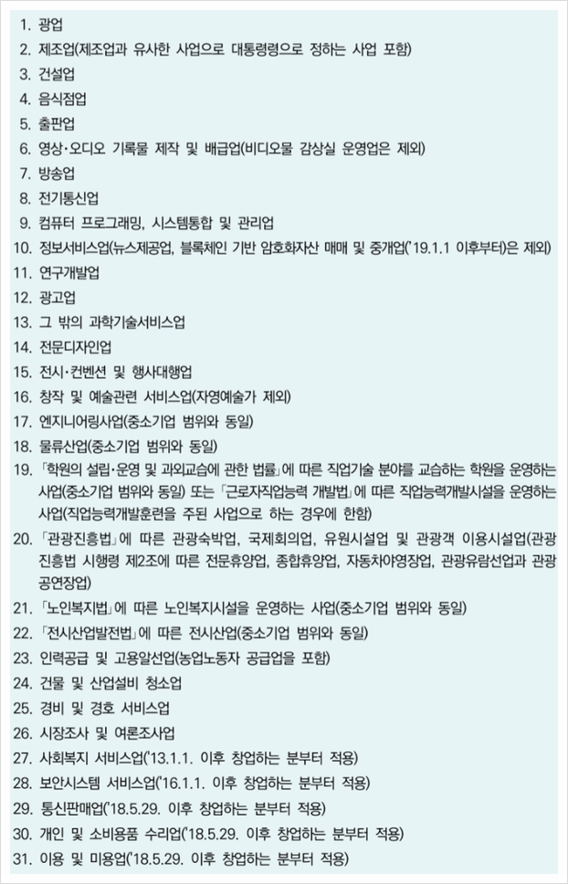 아래 업종의 창업만 해당되므로 창업, 법인 설립을 준비하신다면 눈여겨보시기 바랍니다.