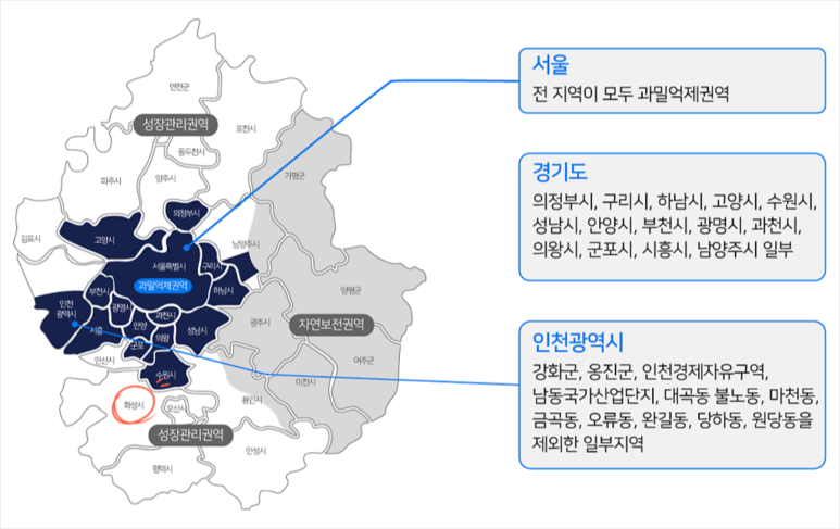 서울은 전 지역이 과밀에 해당하며, 수도권 대부분의 지역이 과밀억제권역에 해당합니다.