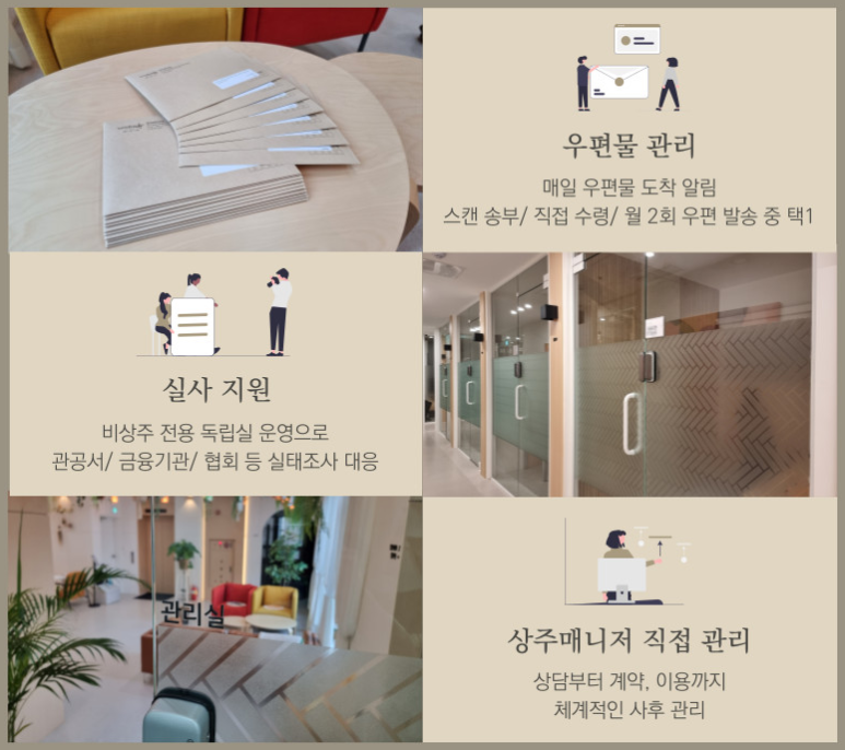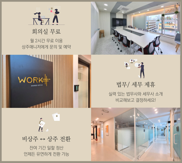 이 외에도 회의실 무료 이용, 법무/ 세무 제휴, 상주 및 비상주 전환도 유연하게 대응하고 있습니다.