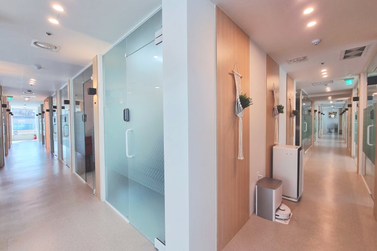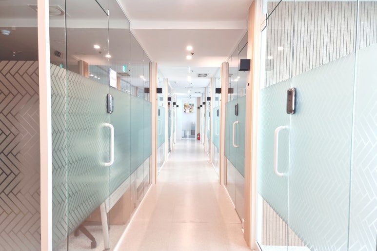 지문 인식으로 통과해야 하는 자동물을 지나면 넓은 프라이빗 오피스와 복도, 여유 있게 배치된 시설을 볼 수 있습니다.