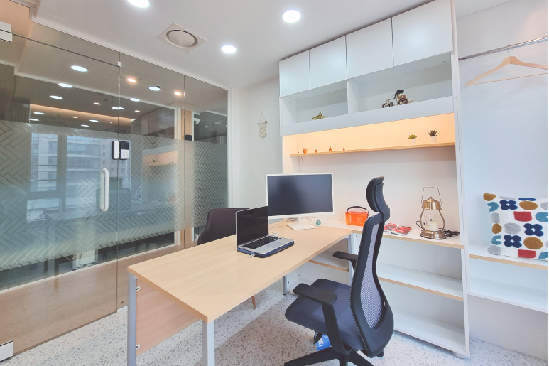 여유 있는 사무실에 제대로 갖춰진 수납공간, 책상, 손님 의자까지 기본 배치됩니다.