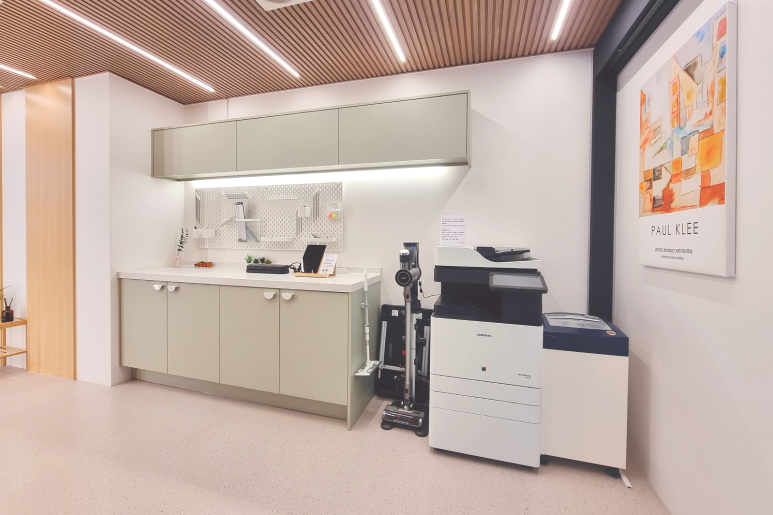 와이파이, 유선랜은 기본이며 출력 및 스캔, 팩스까지 가능한 복합기와 간단하게 사용할 수 있는 사무용품도 비치되어 있습니다.