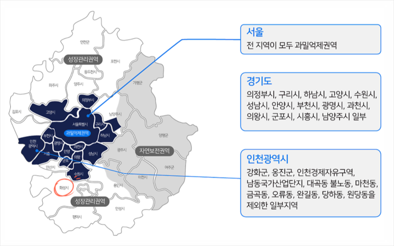 서울시, 성남시, 광명시, 안양시, 부천시, 수원시, 군포시, 의왕시, 의정부시 등이 이 과밀억제권역에 해당합니다.