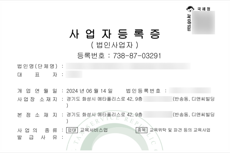 최근에 교육서비스업으로 법인 설립 및 사업자등록을 진행한 사례가 있어서 첨부해 보았는데요.