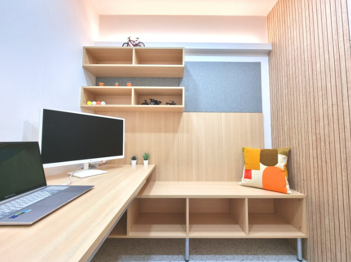 책상 아래 부분에는 넓은 수납공간, 책상 위로는 포인트 수납공간을 구성하여 디자인적인 요소도 반영하여 설계하였습니다.