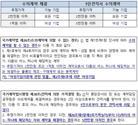 여성기업제품은 소액 수의 가능한 계약 금액도 다릅니다.