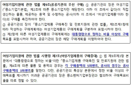 「여성기업지원에 관한 법률」 제9조 및 동법 시행령 제7조에 의거하여 공공기관은 여성기업제품을 물품·용역의 경우 각 구매 총액의 5% 이상, 공사의 경우 구매 총액에서 3% 이상을 구매하여야 합니다.